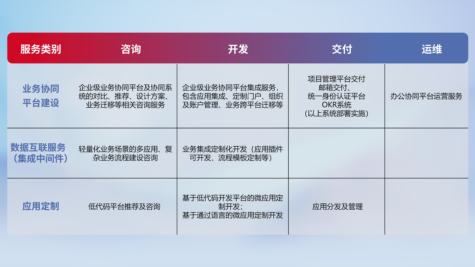 针对钉钉、、、、企微、、IDaas等平台级产品提供产品的规划、、、方案、、、交付、、定制化开发等服务,,,,实现如统一协同办公、、、、智能客户服务、、、、混合会议管理、、智能数据查询、、、等业务场景,,,实现数字化转型。。。